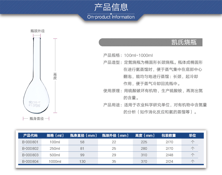 蜀牛 定氮烧瓶 玻璃凯氏烧瓶 实验室高硼硅耐热长颈蒸馏烧瓶100-1000ml