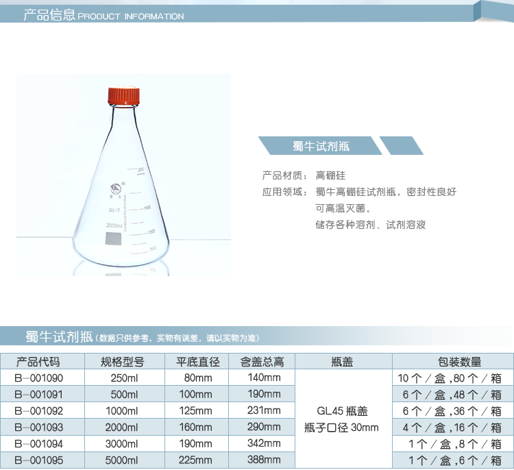 蜀牛 三角烧瓶GL45螺口盖高硼硅玻璃三角瓶 加厚壁锥形瓶PP罗旋盖实验摇瓶2000ml-5000ml