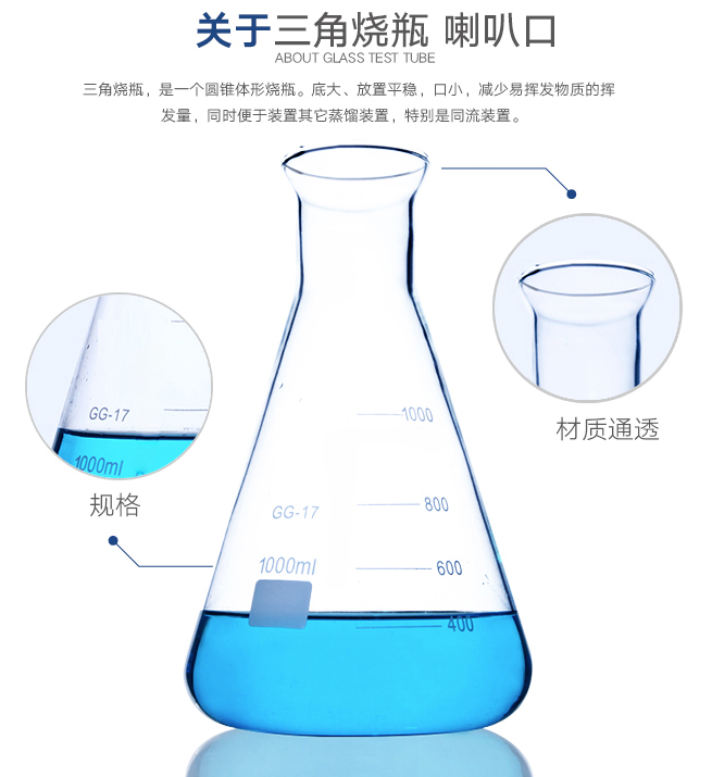 三角烧瓶 喇叭口高硼硅耐热玻璃锥形瓶 实验室三角摇瓶50ml-1000ml